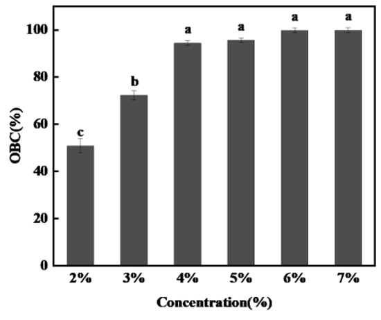 The oil binding capacity (OBC) is used to characterize the strength and ability of the organogels to decrease vegetable oil migration [32]. The OBC values of the organogels with different stigmasterol concentrations are shown in Figure 3. The OBC values were increased significantly from 50.74% to 99.74% when the concentration increased from 2% to 6%. It may be that with the increase in stigmasterol concentration, the internal system of the organogels could form more crystal structures through molecular interactions [33]. This further formed a three-dimensional network structure to fix up the rapeseed oil, resulting in significantly increased OBC values. It was worth noting that the OBC value (99.93%) of organogels did not change significantly with a 7% stigmasterol concentration.