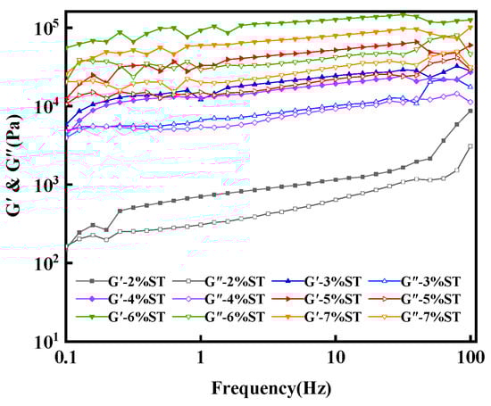 The viscoelasticity of the sample was reflected by frequency scanning. In rheological analysis, the G’ is the elastic modulus of the sample and the G” is the viscous modulus of the sample. Frequency scanning is utilized to reflect the correlation between the viscoelastic modulus and frequency. If the G’ ˃ G” with the increase in frequency, the sample mainly exhibits elastic deformation, indicating that the sample presents solid state. If the G’ = G”, the sample presents a semi-solid state. If the G’ < G”, the viscosity modulus of the sample mainly has viscous deformation, indicating that the sample presents a liquid state. All organogel samples showed a solid-state behavior with the elastic modulus (G’) higher than the viscosity modulus (G”) within the frequency range of 0.1–100 Hz (see Figure 4). Additionally, the G’ and G” values of organogels were independent of the increase in scanning frequency. These results showed that the organogels prepared from different concentrations of stigmasterol had a good tolerance in the test range of deformation frequency and were formed by a non-covalent physical cross-linked gel network structure [32]. Furthermore, the G’ value was closely related to the stigmasterol concentration, the G’ value increased notably when the concentration was increased from 2% to 6%, but the result was reversed at a concentration of 7%.
