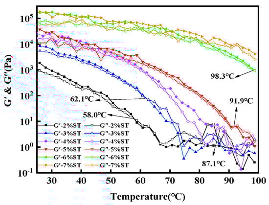 A temperature ramp test of organogels is illustrated in Figure 5 to study the temperature-dependent flow behavior of the stigmasterol organogels. As the scanning temperature increased, the G’ and G” values of organogels were significantly reduced and the critical phase transition temperature (G’ = G”) gradually emerged at the stigmasterol concentration of 2–6%. This result indicates that the organogels showed a viscous behavior at high temperatures in a completely molten state. The critical phase transition temperature increased prominently from 45 °C to 95 °C with the increasing concentration. However, the absence of the critical phase transition temperature was found in the organogels at a 7% stigmasterol concentration, which showed the organogels did not undergo a gel-sol transformation [37]. Therefore, the organogels have high thermal stability with a 7% stigmasterol concentration. This may be because the number of crystals was increased with the increase in the stigmasterol concentration; a higher temperature was needed to destroy the organogel structure [38].