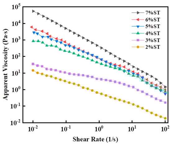 Changes in the apparent viscosity of stigmasterol organogels with different stigmasterol concentrations (2–7%) and shear rates ranging from 0.01 s−1 to 100 s−1.
