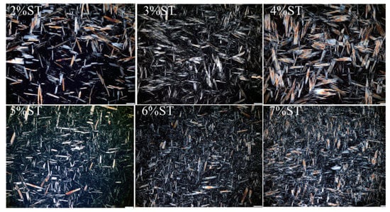 The three-dimensional network structure is the basis of the mechanical properties of organogels [45]. The influence of gelator concentration on the crystal morphology and microstructure in the organogel system was observed using a polarizing microscope image. The results for the organogels are shown in Figure 7. The stigmasterol crystals were uniformly dispersed in the oil phase, appearing as birefringent patches against a black background [46]. The organogel prepared with 2–4% stigmasterol showed a randomly distributed rod-like crystal structure, while the organogels prepared from 5%–6% stigmasterol showed a rod-like crystal structure with close distribution, the crystal units of stigmasterol formed the three-dimensional structure of the organogels. The number of crystals increased significantly and the internal crystal size of the organogels gradually decreased from random crystal to tightly distributed rod structure with the increase of stigmasterol concentration. However, when the stigmasterol concentration was 7%, the crystal structure of organogels partially overlapped [47]. This is probably because a high oleogelator concentration leads to a higher degree of supersaturation which can accelerate nucleation and restricted the further growth of stigmasterol crystals.