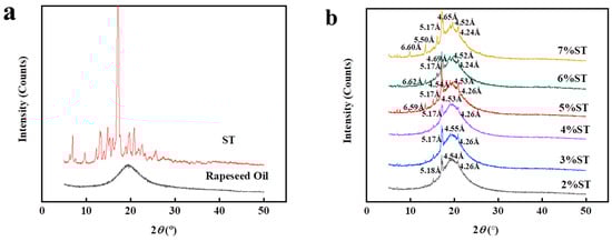 The XRD patterns of rapeseed oil and stigmasterol (a); organogels with diverse stigmasterol concentrations (b).