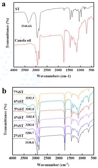 The FT-IR of rapeseed oil and stigmasterol (a); organogels with diverse stigmasterol concentrations (b).
