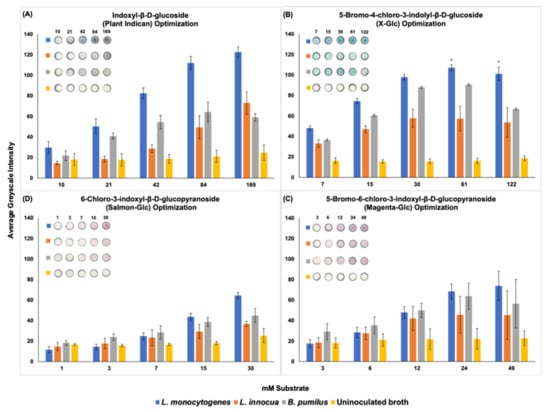 Evaluation of substrates specific for detection of β-glucosidase activity. The average greyscale intensity was determined using ImageJ. Bars show standard deviations of three means. Asterisks (*) represent statistical significance for evaluation of L. monocytogenes and x-glc (p < 0.0001). Digitized colorimetric images. Representative wells are depicted. (A) plant indican, (B) x-glc, (C) magenta-glc, (D) salmon-glc. From left to right on the x-axis is smallest to largest substrate concentration tested in mM.