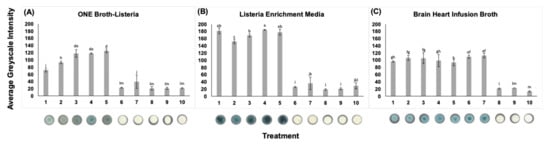 Evaluation of microbiological media for the development of a test specific for the detection of Listeria spp. Target L. monocytogenes was detected using every broth tested. Non-target E. coli and B. pumilus, the latter of which produces the target enzyme β-glucosidase, were both inhibited by the selective enrichment broths ONE Broth-Listeria and Listeria Enrichment Media. The average greyscale intensity was determined using ImageJ. Bars show standard deviations of three means. Means with different letters are significantly different. Digitized colorimetric images. Representative wells are depicted. (A) ONE Broth-Listeria, (B) Listeria Enrichment Media, (C) Brain Heart Infusion broth. From left to right on the x-axis are the following treatments: (1) L. monocytogenes 1 CFU/mL, (2) L. monocytogenes 100 CFU/mL, (3) L. monocytogenes overnight culture, (4) L. innocua 1 CFU/mL, (5) L. innocua 100 CFU/mL, (6) B. pumilus 1 CFU/mL, (7) B. pumilus 100 CFU/mL, (8) E. coli 1 CFU/mL, (9) E. coli 100 CFU/mL, (10) uninoculated broth.