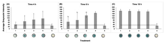 LOD and TTD for the development of a test specific for the detection of Listeria spp. The average greyscale intensity was determined using ImageJ. The threshold value is represented in black. Bars show standard deviations of three means. Means with different letters are significantly different. Digitized colorimetric images. Representative wells are depicted. (A) time 4 h, (B) time 8 h, (C) time 18 h. From left to right on the x-axis are the following treatments: (1) L. monocytogenes 1 CFU/mL, (2) L. monocytogenes 10 CFU/mL, (3) L. monocytogenes 102 CFU/mL, (4) L. monocytogenes 103 CFU/mL, (5) uninoculated broth.
