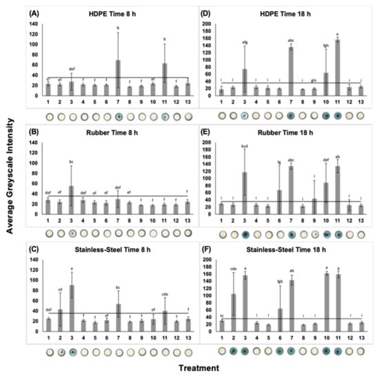 Detection of L. monocytogenes on food contact and non-food contact surfaces using enzymatic colorimetric detection paired with a µPAD platform. Enrichment time points at eight (left panel) and 18 h (right panel) are depicted. After 18 h enrichment, detection of L. monocytogenes on a µPAD platform is clearly discernable upon visual inspection. The average greyscale intensity was determined using ImageJ. The threshold value is represented in black. Bars show standard deviations of three means. Means with different letters are significantly different. Digitized colorimetric images. Representative wells are depicted. From top to bottom: (A,D) HDPE, (B,E) rubber, (C,F) stainless-steel. From left to right on the x-axis are the following treatments: (1) L. monocytogenes 1 CFU/coupon calcium alginate swab, (2) L. monocytogenes 10 CFU/coupon calcium alginate swab, (3) L. monocytogenes 102 CFU/coupon calcium alginate swab, (4) B. pumilus 102 CFU/coupon calcium alginate swab, (5) L. monocytogenes 1 CFU/coupon rayon-tipped swab, (6) L. monocytogenes 10 CFU/coupon rayon-tipped swab, (7) L. monocytogenes 102 CFU/coupon rayon-tipped swab, (8) B. pumilus 102 CFU/coupon rayon-tipped swab, (9) L. monocytogenes 1 CFU/coupon sponge-stick, (10) L. monocytogenes 10 CFU/coupon sponge-stick, (11) L. monocytogenes 102 CFU/coupon sponge-stick, (12) B. pumilus 102 CFU/coupon sponge-stick, (13) uninoculated broth.