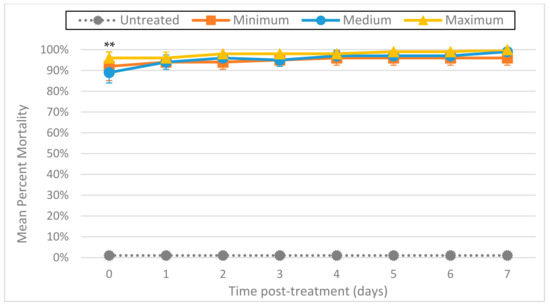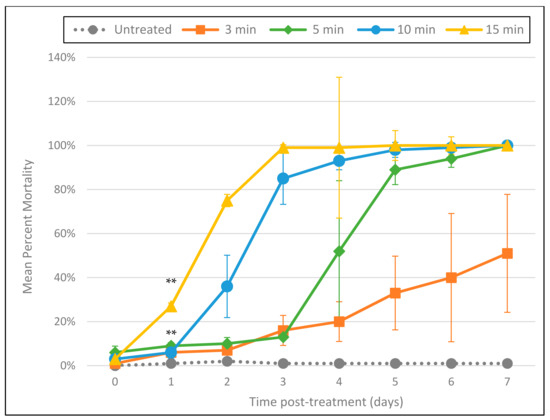 Mean percentage mortality from sonicating A. cantonensis larvae at 40 kHz with the Branson 1510 ultrasonic cleaner for 1 min while simultaneously exposing them to ozone for 5 min from the Enaly OZX-300 at 3 different outputs (minimum, medium, and maximum). All tests were conducted in triplicate. Percentage mortality was normalized by adding the number of dissolved L3 to the number of fluorescent L3, then dividing by the original total number of L3. ** All 3 treatments were statistically significant as compared to untreated controls by day 0 (p ≤ 0.001).