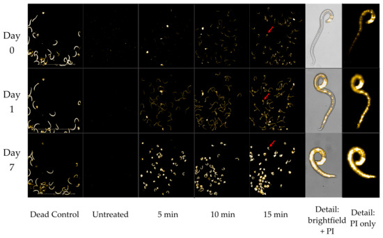 Each treatment run included at least eight tubes of 50 larvae each: one tube of killed untreated, three tubes of live untreated, one tube of killed treated, and three tubes of live treated. Live larvae for each treatment run were prepared by adding 50 live larvae into 20 µL of tap water in three 1.5 mL microcentrifuge tubes. Live untreated larvae served as negative controls. Killed larvae served as positive controls for the propidium iodide assay [35], and were prepared by transferring 200 third-stage larvae into 100 µL of tap water and adding 900 µL of 100% methanol (BDH; VWR International, Radnor, PA, USA), followed by freezing at −80 °C for a minimum of 24 h [35,36]. Tubes of killed larvae controls were thawed and poured into small glass Petri dishes containing 10 mL of tap water, and the methanol was allowed to evaporate for one hour with gentle rocking. Killed control larvae (n = 50) were then transferred into two 1.5 mL microcentrifuge tubes per treatment run (one treated, one untreated).