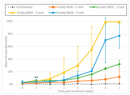 Enaly OZX-300 using direct gas delivery through an air stone at a concentration of approximately 4.5–7.9 mg/L. Comparison of mean percentage mortality rate per day (PI death assay) in response to 3 ozone outputs (minimum, medium, and maximum). All tests were conducted in triplicate. ** All 4 treatments were statistically significant as compared to untreated controls by day 1 (p ≤ 0.001).