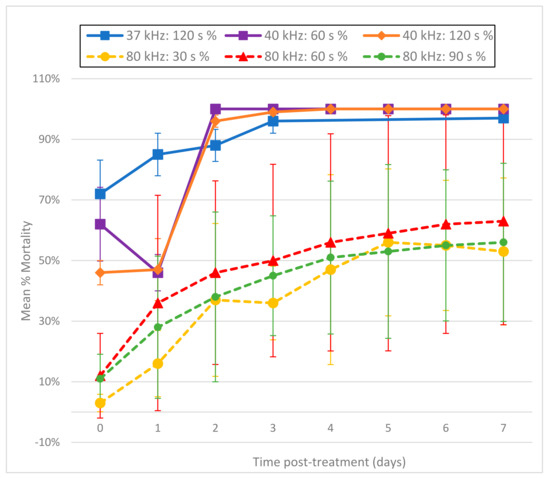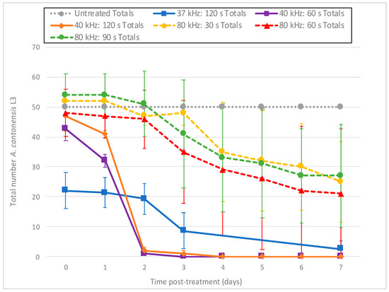 We tested the effects of sonication at both 37 and 40 kHz, as well as at the lower intensity of 80 kHz, and found that 37 and 40 kHz were both fast and effective at killing A. cantonensis L3. A striking aspect of ultrasound was the speed at which it induced larval death, with mortality rates on day 0 (2 h post-treatment) as high as 72% after only 2 min of exposure to 37 kHz (Figure 4). However, such mortality results were quite variable (±11.14 standard deviation, p ≤ 0.001), with some tests with ultrasound leaving small numbers of L3 still motile. This variation was probably due to spatial variations in ultrasound intensity within the water bath, as rates of mortality appeared to be dependent upon the placement of the tube of larvae within the bath of the ultrasonic cleaner.