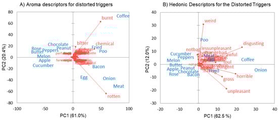 Frequencies of words used to describe the set triggers and faecal odour; PC1 vs. PC2 (A) = aroma descriptors, (B) = hedonic descriptors. Blue denotes set triggers; red denotes descriptors. Raw data are provided in Supplementary Table S1.