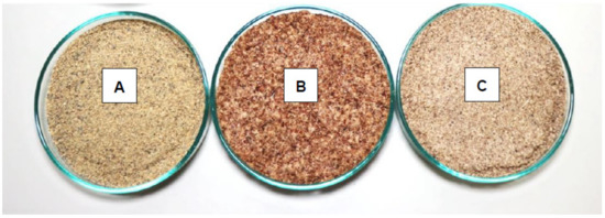 Ground edible insect flour of three different species. (A) G. belina; (B) M. subhylanus; and (C) H. illucens.