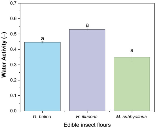 Water activity of three edible insect flours. Values are mean ± standard deviation, means with different superscripts are significantly different (p < 0.05).