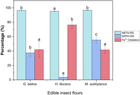 Scavenging effect of DPPH-RS, ABTS-RS and Fe2+ chelating activity of edible insect flours. Values are mean ± standard deviation; means with different superscripts are significantly different (p < 0.05).
