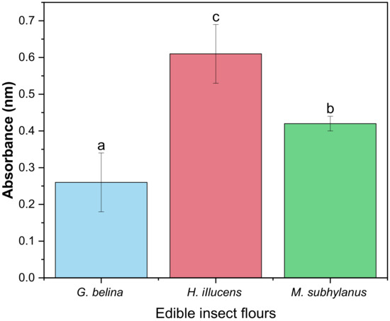 The DPPH radical-scavenging (DPPH-RS) assay is a widely used method for evaluating the ability of food matrices to scavenge free radicals generated from the DPPH reagent, which undergo SET mechanism [67]. DPPH is a stable free radical that shows maximum absorbance at 517 nm in ethanol and changes from purple to yellow in the presence of antioxidants. When a DPPH radical encounters an electron-donating substrate, such as an antioxidant, the radical is scavenged [68]. As illustrated in Figure 3, the insect flours differed significantly (p < 0.05) from one another, with M. subhylanus (55.57%) exhibiting the highest radical scavenging activity followed by G. belina (37.44%) and H. illucens (3.63%), respectively. In a study reported by Navarro del Hierro et al. [69] T. molitor and A. domesticus extracts, the DPPH-RS was 57 and 72%, respectively, and the values for T. molitor are comparable to those of M. subhylanus from this study. Nabil et al. [70] also reported on Moroccan cladode flour, and the radical scavenging activity was between 7.18 and 72.37%, which is in line with the radical scavenging activity reported in this study. The results, therefore, suggest that the edible insect flours could be scavenging agents and imply that they have the ability to react with free radicals. This study supports the observation of Mshayisa and van-Wyk [26], who proposed that edible insects can be used as novel functional components in food compositions.