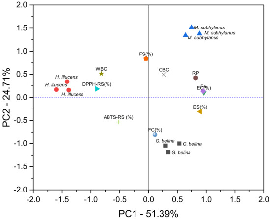 Principal component analysis (PCA) was performed to understand the inter-relationships among the measured techno-functional properties and antioxidant activity indices and the similarities and differences among the edible insect samples. The suitability of data reduction by PCA was established by several factors, such as the high correlations between the variables (correlation matrix) and the significant (p ≤ 0.05) Bartlett’s test, as well as the Kaiser–Meyer–Olkin measure (0.68), which was significantly higher than the recommended minimum of 0.6. The PCA results were displayed using score and loading plots (Figure 5). To determine the relative contributions of the principal components in overall total variability, only the eigenvalues greater than one were considered. Thus, the first three principal components (PC1, PC2 and PC3) were found to be significant and explained 87.99% variability in the data set (Table S1). Component 1 accounted for 51.39% of the total variability, and represented EC (0.960), Fe Chelation (0.949), ES (0.897) and DPPH-RS (−0.897) while FS (0.837), FC (−0.080), ABTS-RS (−0.531) and WBC (0.515) contributed to PC2, with a total variability contribution of 24.71%. The PC3 accounted for 11.89% of the total variability due to OBC (0.745), FC (0.504), ABTS-RS (0.442) and RP (0.247), respectively, as shown in Table S1 (Supplementary Materials). The edible insects were clearly distributed into three clusters (Figure 5). It can be seen that M. subhylanus can be separated from H. illucens based on the DPPH-RS, WBC, and foam stability. In Figure 5, H. illucens were grouped in close proximity with values of component 1, whereas M. subhylanus and G. belina are diametrically opposed in PC2 (meaning they are on the negative and opposite sides). PCA showed that M. subhylanus and G. belina located on the opposite sides of PC2, the FS, OBC and FC were to be majorly responsible for the difference in the edible insect flours. This was due to the high FC and OBC exhibited by M. subhylanus samples, while G. belina exhibited the lowest OBC. Therefore, PCA could be helpful to provide valuable information on the classification and discrimination of edible insect flours and on relationships between antioxidant indices and techno-functional properties.