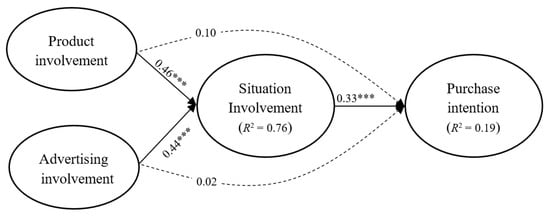 The SEM results (Figure 2) supported H1, H2, H3, and the proposed mediation model. The standardised path coefficient of the path from product involvement to situational involvement was 0.46 (Cohen’s f2 effect size = 0.06), and that of advertising involvement to situational involvement was 0.44 (f2 = 0.12); product involvement and advertising involvement had a significant direct effect on situational involvement (R2 = 0.76). Furthermore, the standardised path coefficient of the relationship between situational involvement and purchase intention was 0.33 (f2 = 0.03), and situational involvement had a significant direct effect on purchase intention (R2 = 0.19). The standardised paths between product involvement and purchase intention and between advertising involvement and purchase intention were nonsignificant.