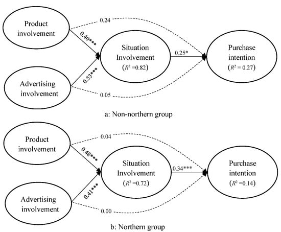 The moderating role of residential region in the relationship between situational involvement and purchase intention was assessed through multigroup analysis of the northern and nonnorthern groups and application of the χ2 difference test in the constrained and unconstrained models. Moderation existed if the constrained model exhibited a significant positive change in χ2 compared with the unconstrained model [63]. The results reveal a significant change in χ2 between the constrained and unconstrained models (Δχ2 = 8.31, Δdf = 1, p < 0.004), indicating the presence of the moderating effect. The effect of situational involvement on purchase intention in the nonnorthern group (β = 0.25, p < 0.001, f2 = 0.01, Figure 3a) was weaker than that in the northern group (β = 0.34, p < 0.001, f2 = 0.03, Figure 3b). The SEM results illustrated in Figure 3 support H4 and the proposed moderation model.