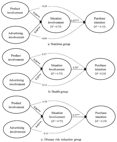 The moderating role of advertising claims in the relationship between situational involvement and purchase intention was also tested through a multigroup analysis of three groups (nutrition, health, and disease risk reduction claims). A significant change in χ2 was revealed between the constrained and unconstrained models (Δχ2 = 3.48, Δdf = 2, p > 0.05) as a result of the moderating effect. The effect of situational involvement on purchase intention in the nutrition group (β = 0.45, p > 0.001, f2 = 0.05, Figure 4a) was stronger than that in the health group (β = 0.20, p < 0.001, f2 = 0.01, Figure 4b) and disease risk reduction group (β = 0.37, p > 0.001, f2 = 0.03, Figure 4c). The SEM results illustrated in Figure 4 supported H5 and the proposed moderation model.