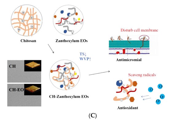 In this study, Zanthoxylum extracts as an additive agent includes relatively complex components in it. As a results, diverse types of interactions would be established when Zanthoxylum extracts mixed with chitosan molecules (as shown in Figure 1C). Generally, the whole mechanical properties of a composite material always depend on its weakest link, while WVP is conversely dictated by the most active composite. It can explain why the introduction of Zanthoxylum extract decreased the mechanical properties of the composite film and increased its WVP in this work [4].