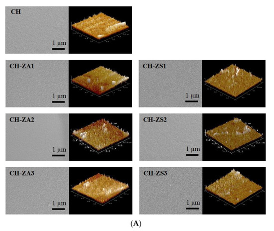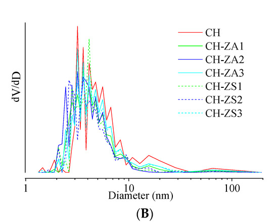 Porosity is also an important property for a film. As shown in Figure 2B, major responses of pure chitosan were around the diameter of 2.8~5.6 nm. The introduction of Zanthoxylum extracts in chitosan broadens the peaks around the range of 2.1~8.3 nm, due to phenolic and olefin compounds in the Zanthoxylum extracts can results in more ionization in chitosan.