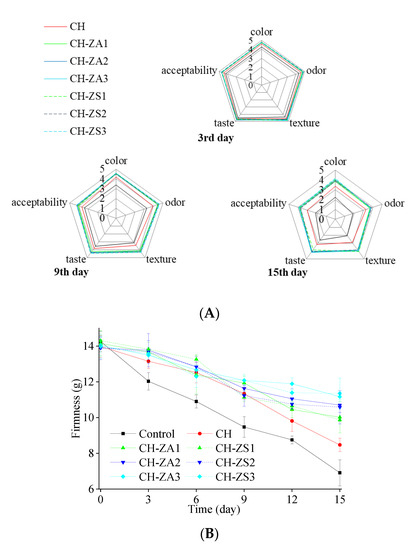 Generally, the differences in sensory properties of fruits are affected by species, maturity and size, as well as culture circumstance, harvesting season and storage atmosphere. In this study, sensory score showed decreasing trends from initial score of 5 (as Figure 3A). Control samples had most significant declines in sensory scores compared to the other samples, which reached 1.86~2.64 at the end of the storage. By comparison, the scores of the samples with CH shell were still kept at 2.92~3.36, and CH-extracts shell were still more than 3.7. The phenomenon can be attributed to that the inhibition of chitosan shell on spoilage process of the preserved products. The effects can be enhanced by the introduction of Zanthoxylum extracts.