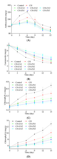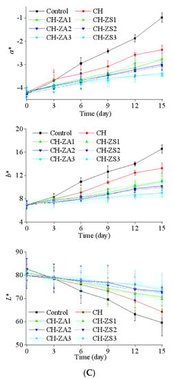 Figure 5C,D displayed the increase of both chlorophyll α and chlorophyll during the storage. In the control samples, highest contents were obtained in both chlorophyll α and chlorophyll β, represented by the values varied from 2.08 mg/g to 4.39 mg/g and from 5.51 mg/g to 12.95 mg/g during the storage, respectively. The followed contents were detected in the samples with CH shell. The initial contents were 2.06 mg/g and 5.47 mg/g and increased to 3.48 mg/g and 10.41 mg/g at the end of the storage, respectively. The lowest chlorophyll content was found in the samples with modified shells. During the storage, the chlorophyll content in the samples with CH-ZA shell increased from 2.02 mg/g (chlorophyll α) and 5.49 mg/g (chlorophyll β) to 2.57 mg/g and 7.19 mg/g, while the contents in the samples with CH-ZS shell increased from 1.96 mg/g (chlorophyll α) and 5.50 mg/g (chlorophyll β) to 2.56 mg/g and 7.08 mg/g. The reason for the trends is that CH shell as a protective barrier can effectively protect the preserved products from the contact of oxygen, which may help to accelerate breakdown process of cells and release the chlorophyll contents [4].