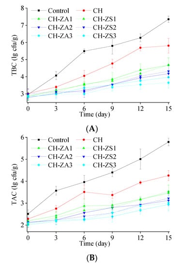 As remarkable antimicrobial agents, Zanthoxylum extracts displayed good antimicrobial effects as a additive agents in chitosan. As shown in Figure 4, upstream trends of microbial counts were presented in both control and treated groups, and such growths were obviously suppressed by the shells. At the beginning of the storage, the initial TBC in all samples were ~2.9 log CFU/g. In the end, compared to the final counts of 7.35 log CFU/g in the control samples and 5.81 log CFU/g in the samples with CH shell, the final TBC were 3.97~4.67 log CFU/g and 3.65~4.69 log CFU/g in the samples with CH-ZA shell and CH-ZS shell, respectively. Meanwhile, TAC exhibited similar trend during the storage. The initial counts in all samples were ~2.2 log CFU/g. After 15 days of storage, the counts increase to 5.97 log CFU/g and 4.26 log CFU/g in the control samples and CH samples, while they were 2.94~3.46 log CFU/g in the samples with CH-ZA shell and 3.01~3.53 log CFU/g in the samples with CH-ZS shell.