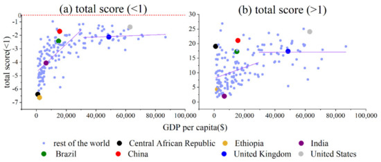 As for the Central African Republic, Ethiopia, India, Brazil and China, their total scores (both >1 and <1) increase quickly as GDP per capita increases. As for the United Kingdom and United States, their total scores (both >1 and <1) increase much more slowly as GDP per capita increases.