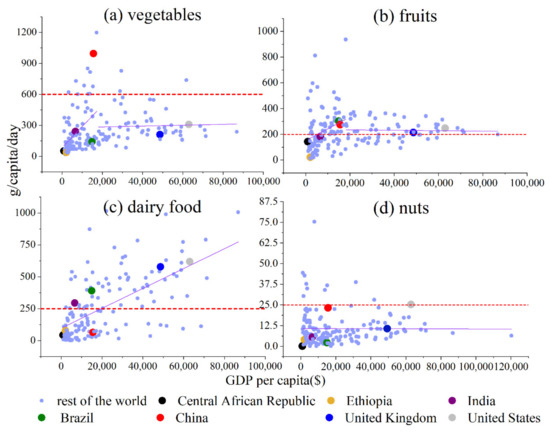 According to the PHD, the recommended consumption amount is 250 g/capita/day for dairy food. As shown in Figure 2c, dairy food does not have a GDP per capita threshold. The slope of increasing is . The dairy food consumption quantities (g/capita/day) of Central African Republic, Ethiopia, India, Brazil, China, the United Kingdom and the United States increase as the GDP per capita increases.