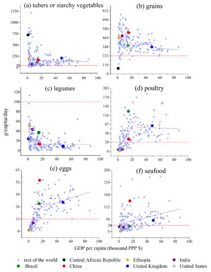 GDP per capita vs. food consumption amounts of (a) tubers or starchy vegetables, (b) grains, (c) legumes, (d) poultry, (e) eggs, and (f) seafood (those foods should be consumed in moderation).