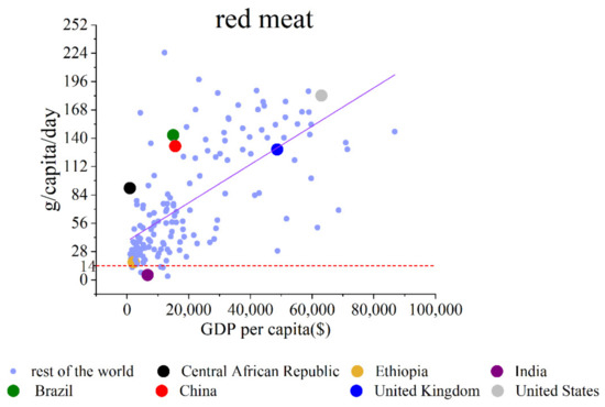 According to the PHD, the recommended consumption amount is 14 g/capita/day for red meat. Red meat does not have a GDP per capita threshold. The increasing slope is . The meat consumption quantities (g/capita/day) of the Central African Republic, Ethiopia, India, Brazil, China, the United Kingdom, and the United States increase as the GDP per capita increases. The relationship between GDP per capita and red meat consumption is shown in Figure 4.