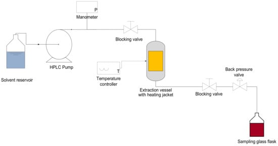 The extractions were performed in an experimental equipment (Figure 1) following the method described by Santos et al. [40] with some modifications. This equipment consisted of a solvent reservoir, an HPLC pump (Jasco Corporation, model PU-2080, Tokio, Japan) to pump the solvent, a manometer to measure the pressure, and a 6.57 mL extraction vessel, which was connected to a temperature controller. This cell was placed inside an electric heating jacket. In addition, the equipment had two blocking valves and a back pressure valve to maintain constant pressure during extraction. The system connections were made with stainless steel tubing (1/16″ and 1/8″). The effects of PLE temperature (40 and 60 °C) and pressure (20, 40, 60, 80, and 100 bar) on the extraction yield of extracts obtained were studied. For that, a 2 × 5 randomized full factorial design was used, totaling 10 treatments and 20 responses since all treatments were performed in duplicate. The particles of PPCM already prepared (6 g on a d.b.) were placed inside the extraction cell (6.57 mL) of the PLE equipment and heated by a heating jacket until reaching the desired temperature. Then, the system was pressurized with the solvent using an HPLC pump. After reaching the desired pressure by closing the solvent outlet with the blocking valve, the pressure was kept for a static extraction time of 10 min until reaching the system equilibrium. Immediately afterward, the blocking and back-pressure valves were opened and carefully adjusted to maintain the required system pressure. Then, the dynamic extraction started by pumping the solvent, which penetrated throughout the vegetal matrix, extracting solvent-soluble biocompounds at a constant flow rate of 1 mL/min. The dynamic extraction time was around 76 min, and the solvent-to-feed ratio (S/F) was 10. The ethanolic solution containing the PPCM extract was collected in a volumetric glass flask at room temperature. The ethanol was evaporated using a rotary evaporator under a vacuum at 40 °C in the absence of light. The extracts were placed in a desiccator until reaching constant weights. Afterward, the extracts were protected from light to prevent the degradation of the compounds. Thus, they were stored at freezing temperature for further analysis.