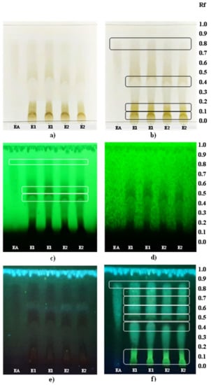 TLC analysis of extracts E1 (40 bar) and E2 (80 bar) under (a) visible light without NP, (b) visible light with NP, (c) UV light at 254 nm without NP, (d) UV light at 254 nm with NP, (e) UV light at 366 nm without N, and (f) UV light at 366 nm with NP.