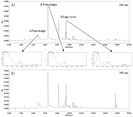 The extracts E1 and E2 presented a total of 19 phenolic compounds according to HPLC-PDA results. Representative chromatograms of the pomegranate extracts are shown in Figure 3. Six compounds were observed in significant amounts, and three of them were identified and quantified [35,64,65].