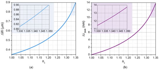 (a) Evanescent penetration beyond the geometrical diameter of the NC-MMF (second term in Equation (2), labeled as ) as a function of . (b) Wavelength shift with respect to a baseline condition where the NC-MMF is surrounded by air as a function of . The insets show in more detail the range of interest for water–milk mixtures (see text for details).