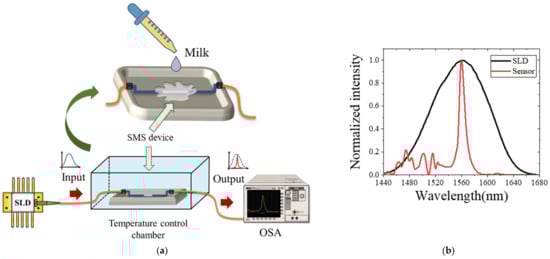 (a) Experimental set-up for water-adulterated milk detection. (b) The spectrum of the SLD light source and the SMS sensor.