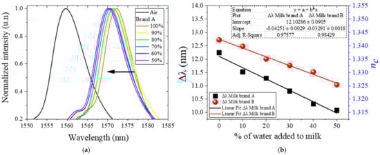 Moreover, if in Figure 4a, one takes the spectrum of the undiluted sample as reference, the spectra for the diluted samples suffer a negative spectral shift that is proportional to the dilution level. This characteristic behavior is due to the fact that water has a lower RI than milk; thus, the effective RI of the water–milk mixture decreases with an increasing amount of water present in the dilution.