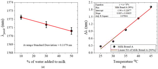 We also studied the errors and repeatability of the measurements, for which we selected representative samples with milk brand A in concentrations of 90%, 70%, and 50%. For each of the samples selected, the wavelength peaks were measured and repeated three times following the same process described above, including washing, cleaning, and drying of the sensor. These wavelength peaks are plotted in Figure 5a. The average standard deviation of all these repetitions is approximately 0.3379 nm.