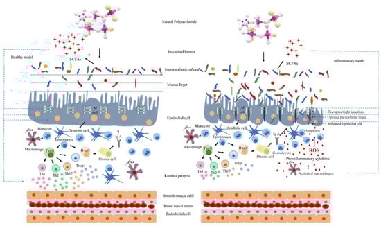 Schematic of mechanisms via which natural polysaccharides (NP) improve inflammatory bowel disease (IBD) through intestinal microbiota. A: Healthy model; B: Inflammatory model. ROS: reactive oxygen species.