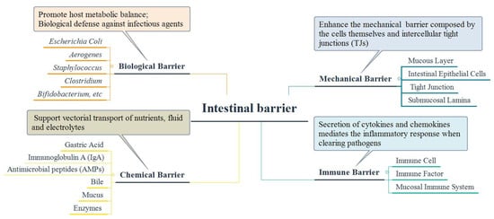 The intestinal barrier, including mechanical, immune, chemical, and biological barriers [25], constitute the “first line of defense” against pathogen invasion in the human body. Figure 3 summarizes the composition and function of the intestinal barrier. Repairing damaged intestinal barriers has become the primary goal of IBD treatment [97]. Intestinal dysbiosis influences the integrity of the intestinal barrier and induces IBD [98]. Under normal circumstances, the mechanical, chemical, and immune barriers can all be regulated by microbial metabolism [99]. However, intestinal microbiota dysbiosis, i.e., a decrease in beneficial microbes and an increase in harmful microbes, would destroy the intestinal barrier [100]. The growth of bacteria with strong mucus degradation ability, for example, Ruminococcus torques, would be increased. In contrast, the proportion of bacteria with weak mucus degradation ability, such as Akkermansia muciniphila (A. muciniphila), decreases significantly. The abundance of some probiotics, such as Lactobacillus, Bifidobacterium, and Prevotella, would reduce when the bacterial membrane barrier is destroyed. In healthy individuals, beneficial bacteria that can inhibit the adhesion and colonization of pathogenic bacteria to protect against damage to the intestinal barrier are distributed in the mucus layer [85,101].