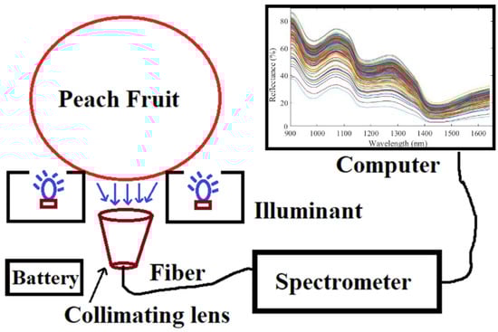 Currently, determination of peaches’ SSC mainly depends on the destructive refractometry detection method, it can obtain high precision, but it destroys the integrity of fruit samples, causing damage of fruit and affecting secondary sales. At the same time, the speed of the refractometry method is just for random determination, and thus it is not suitable to detect high-throughput samples [4]. Therefore, the realization of a simple and rapid non-destructive determining technology for the internal quality of peaches, can not only improve the market economic value of peach fruit, but also standardize the management of the peach market and promote the income of fruit farmers, which has important guidance for the industrial upgrading of the fruit market [5,6,7].