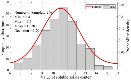 The histogram of peaches’ SSC is shown in Figure 2. Values of SSC in these 266 samples are distributed normally in the range of 6.4 ~15.5%, and the average value is 10.89% with a standard deviation of 1.7%. The range of the ‘Xinchuanzhongdao’ cultivar’s SSC measured in this research is similar to that of ‘Hongmi’ cultivar [29] and ‘Aurora-1’ cultivar peach fruit [30], indicating the random harvest of sample fruits with a small difference of SSC between peaches’ cultivars. It also observes that during the period of harvest the maturity of peaches is in a broad range, inferred by the distribution of peaches’ SSC.