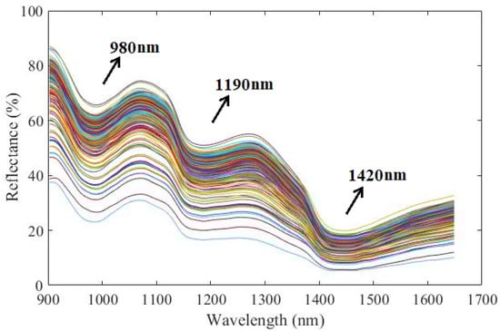 Original near infrared reflectance spectra of peaches. One curve stands for one sample. Spectral curves with different colors are convenient for readers to view the trend of spectra.