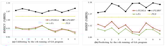 It can be seen from Figure 4a that the root mean squared error of cross-validation (i.e., RMSECV) in the calibration set by the consensus model (Fc) is close to or slightly lower than that of the corresponding PLSGA model (fi1), and the tendency of these two models’ performances are consistently validated in the calibration set. However, it turns out to be completely different in the prediction stage. The consensus model obtained the average RMSEP of 1.106% with a standard deviation of 0.0068, while the optimized PLSGA model achieved the averaged RMSEP of 1.116% with a standard deviation of 0.0097. In Figure 4b, each consensus model (Fc) performed better than the optimized PLSGA model (fi1) in predicting the prediction set, and their performances (Fc) were promoted with an average of 2.27% in the range of 0.98~3.42% in the calibration set, and were enhanced an average of 3.14% in the range of 2.57~4.03% in the prediction set compared to the original PLS model. Among these, the F6c consensual model reduced RMSRP to 1.096% with the highest improvement of predictive capacity. Obviously, consensual models among these developed models trended to be more stable with small fluctuations in the prediction stage.