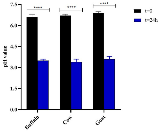 At time zero, before inoculation with starter cultures, the pH values were slightly different depending on the origin of the milk, i.e., the pH values of buffalo, cow, and goat milk were close to neutral (6.60 ± 0.2, 6.70 ± 0.1, and 6.89 ± 0.1, respectively). After 24 h of fermentation, the pH values of buffalo, cow, and goat milk had decreased significantly (3.5 ± 0.1, 3.4 ± 0.2, and 3.6 ± 0.1, respectively) from the initial value due to the fermentation of lactose by the LAB producing lactic acid (Figure 1) [28,29].