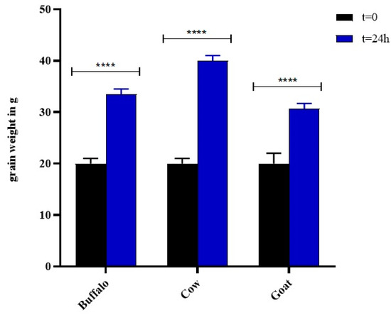 Mean values of grain weight ± standard deviation at 0 h and 24 h of fermentation time. Histograms and error bars represent the mean of independent experiments performed in triplicate and standard deviation, respectively. Asterisks on bars indicated that mean values were statistically different from time zero (**** p < 0.0001).