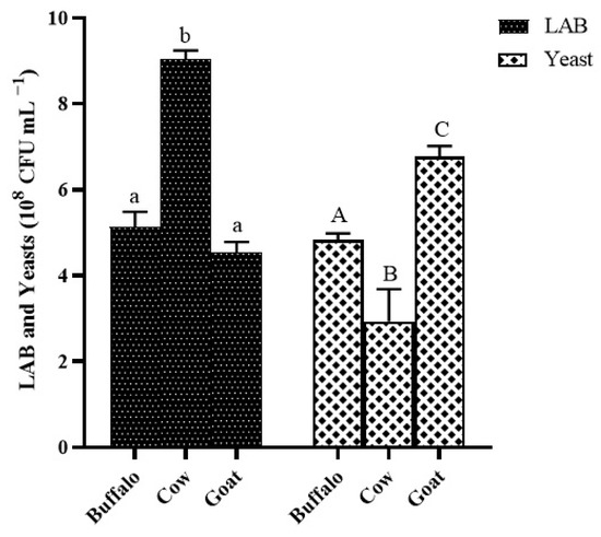 Cell counts of lactic acid bacteria and yeast populations in kefir grains from fermented buffalo, cow, and goat milk after 24 h. Histograms represent the averages of three independent experiments (each done in triplicate) and error bars indicate the standard deviation. Letters on histograms denote statistical analysis. Values with the same letter are not significantly different, values with different letters are significantly different (LAB: buffalo vs. cow, cow vs. goat; Yeast: buffalo vs. cow, buffalo vs. goat, cow vs. goat).