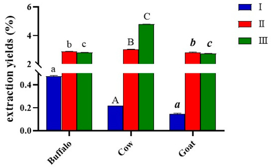 Extraction yields of kefiran, expressed as %, as influenced by the different extraction methods of using cold water (I), hot water (II), and a hybrid mild heat-ultrasound (III) method. The letters on the histograms indicate the statistical analysis. Values with the same letter are not significantly different; values with different letters are significantly different (Buffalo: I vs. II, I vs. III, II vs. III; Cow: I vs. II, I vs. III, II vs. III; Goat: I vs. II, I vs. III, II vs. III).